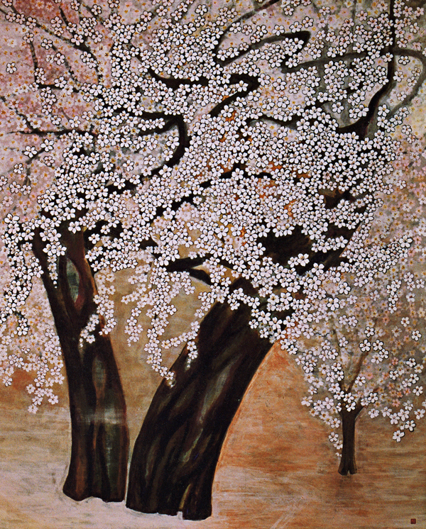 "Sakura - Mankai." Created in 2001. Kajima Noriko - Nihonga no Sekaiten PARTⅠ. Received an A・M・S・C parolaru emblem award. Used for a 2013 stamp at an Australian International Stamp Exhibition. In a collection of Kajima Noriko Geijutsu Kinenkan.