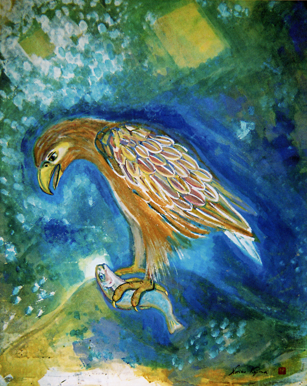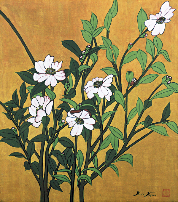KAJIMA Noriko (1946 -) Japanese-style painter. Born in Tokyo and currently resides in Minato Ward. Born into a family of Japanese-style painters, following her grandfather Shoshu and father Ichiro. She aims to create new things based on traditional spirit and techniques. Once every four years she holds an exhibition called “Kajima Noriko – The world of Japanese-style painting” at Bungeishunju Gallery in Ginza. In 2005 “Cherry blossoms in full bloom” received a high-quality award from AMSC. “Sasanqua” was selected for a Le Salon exhibition. “Plum berries” received an “Autumn moon over a calm lake” award at a China-Japan International Contemporary Art Exhibition. “Cymbidium in the mirror” received the “Prix d’Or (special)” award at the Festival International d'Art Cote d'Azur, and was brought into the collection of the Principality of Monaco’s Ministry of Culture in celebration of the accession of the current King Albert II. “Chart of wind and thunder gods” received a from Thailand’s royal family a selected art award for exchanges between Japan and Thailand in celebration of the princess’ birthday. In 2011 it was made into a postage stamp and exhibited at the “Japan World Stamp Exhibition.” In 2013 “Cherry blossoms in full bloom” was exhibited at the “Australia International Stamp Exhibition.” Other main works include “Sacred Mt. Fuji,” “Dragon god,” “Tribe of elephants,” “Banquet of the Seven Gods of Good Fortune,” “Bottom of the ocean,” “White god,” “Japanese crane,” “Red plums and white plums,” and “Allosaurus fossil.” Full member of Spain’s Museo Nacional de Prado. Published “Kajima Noriko – The world of Japanese-style painting,” a collection of her works. Shows her works to the public at “Kajima Noriko Art Commemorative Hall” in June every year.