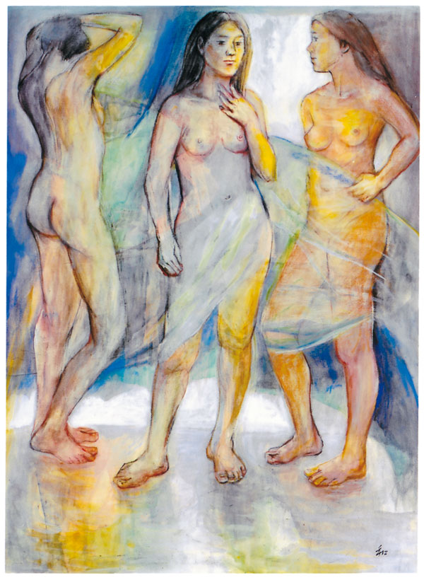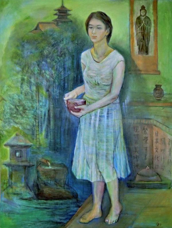 Kazuko Kitao, 1933~. Painter. Born in Tochigi Prefecture. Lives in Tokyo. Majored in fine arts at Utsunomiya University (Faculty of Arts). After graduating, Kitao started teaching at public junior high schools, and her painting career, which started when she was a student and encompasses watercolors, oil painting, and printmaking, has continued for over 50 years. Many of her works focus on people, including groups of people. They often express everyday interaction or touching moments. Although she often works with watercolors, she uses a variety of materials depending on the motif. For 30 years, Kitao has painted people, studied the human form, and arranged meetings at the Japan Watercolor Institute. She has also put a lot of energy into studying clothes design. She has been exhibiting at the Japan Watercolor Exhibition since 1972, and twice she was won prizes. She has also held 15 private exhibitions at places such as the Ginza Towa Gallery. In addition, she has participated in many group exhibitions, and shown her work at international printmaking exhibitions in Malaysia and Bulgaria. She has exhibited oil paintings at the Souzouten Exhibition, and other works at the Nerima Art Museum and various public facilities. Former watercolor teacher at the Shoto Museum. Member of the Japan Artists Association. Member of the Japan Watercolor Society.