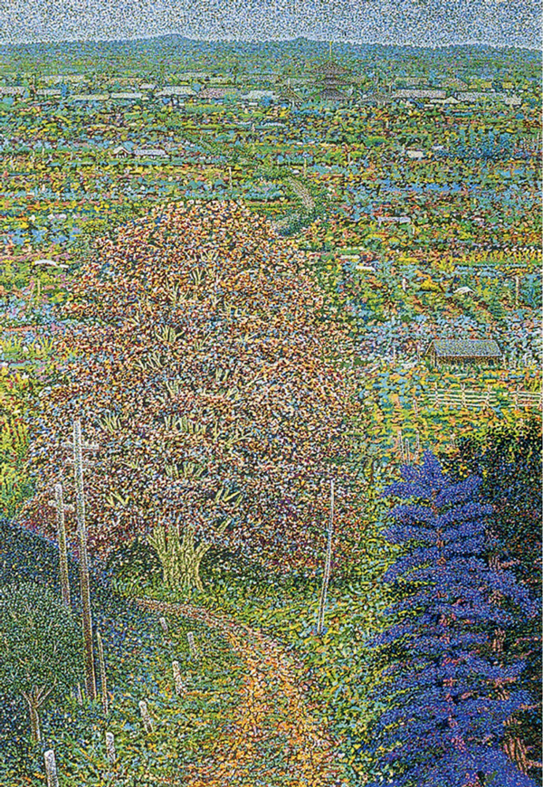 Hoko Mimori, born in 1938, a Japanese painter. Born in Kagoshima Prefecture, Mimori currently lives in Nara Prefecture. His real name is Ichiro. He took apprenticeship under Kinosuke Ebihara, a Western-style painter, in 1961. His Western-style paintings have entered and won at Kokusaiten as well as Gendaiten. He shifts to Japanese paintings after Ebihara’s death in 1968 and enters Seitosha directed by a Japanese artist, Banpo Okahashi. He aspires to find his style through the investigation of Japanese paintings and the foundation in both Western and Japanese theories and style. His work have appeared in exhibitions including the Japan Fine Arts Exhibition, SinNissyunten, and Senbatsuten. He won his first Japan Fine Arts Exhibition award in 1979 with Noto no Hatake and submitted Kogen no Numa to SinNissyunten. He has also submitted Asuka no Sato, Hoshun, Obed no Mura, and Arles Kogai to multiple competitions including France Bijyutsushoten and France-Japan Multinational Contemporary Art Exhibition. Despite his promising future, he resigns from the Japan Fine Arts Exhibition in 1985. He remains a judge in prefectural and municipal exhibitions but resigns completely in 1987. He becomes a freelance artist and travels to France in 1987 for training. He was on an art pilgrimage around Europe while his stay in Grasse, South France. His style changed when he returned to Japan, painting in a beautiful harmony of colors and shapes around the theme of nature. For example, red roof and white walls stand out in his works. His work are well-received both nationally and internationally. He has won many awards including the 1992 Société des Artistes Français Award and France-Japan Multinational Contemporary Art Award. He has also received the 2019 Grand Award for the Artist of Global Cultural Merits. He is currently a member of Japan Artists Association and Global Artists Association.