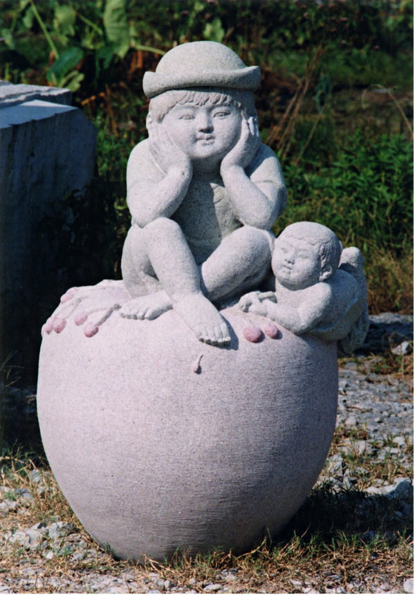 Stone sculpture titled “A Village of Creative Boys” (Stone used: “fine grain Hanazawa stone (gray granite)” from Aichi Prefecture)