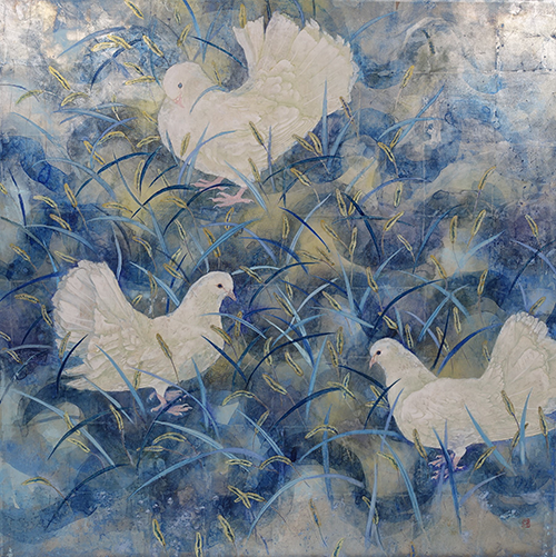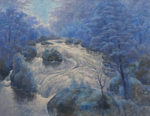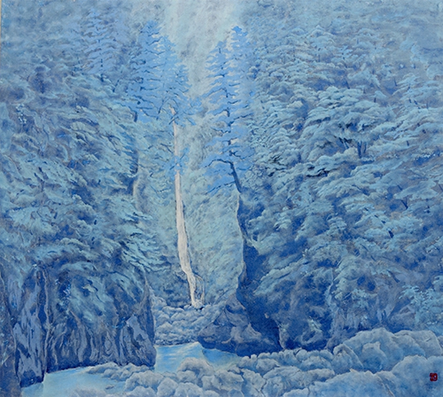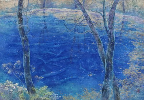 國方盛行(くにかたもりゆき) 昭和12年~(1937~)日本画家。大阪府生まれ、豊中市在住。京都市立美術大学専攻科修了。無所属。新制作協会 日本画部入選4回(1962~ 1968年)「新制作協会春季展」入選7回。個展4回。代表作に 『よこたわるⅠ・Ⅱ』(1964年)『残雪』(1996年、2003年)。壁画(徳島県三好郡三好町庁舎)『美濃田の淵』(1985)がある。作品は日本人でしか表現しえない心の原風景を、神秘性と簡潔な造形を目指して制作している。これは戦争の恐怖体験とその後の疎開先での美しい村。作品はこの相反する心の原風景から湧き出るイメージだという。