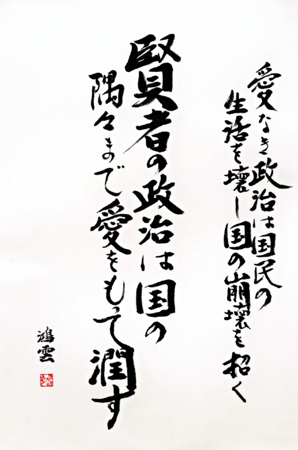 永沼鴻雲(ながぬまこううん)昭和16年~(1941~)工芸家。宮城県石巻市生まれ。現在在住。本名・英夫。書法家・靉翠洋に師事。1980年硯石銘「大和銀星石」を発見する。1981年「鴻雲硯」を創始。1983年、伐採された古木の根 を掘り起こし木根壷『鴻雲の壷』を創始。創作に対する考え方は、【宇宙、地球という生命体の中の一生命体として生かされている自分。ゆえに,大自然に尊厳と感謝の心をもって作品の素材である石や木の真美を求め続けている】である。2011年の東日本大震災の被災を受け、今なお仮設住宅暮らしの生活の中で創作活動を続け、最近、発表した作品は自然の驚異を謳った【詩と絵】である。人生の四季を重ねあわせながらの創作人生を送っている作家である。工芸の代表作は硯『天地』、壺『悠久の泉』がある。