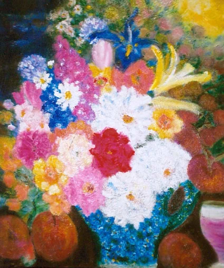 柴﨑敏子(しばさきとしこ)昭和13年~(1938~)洋画家。北海道生まれ。現在、神奈川県横浜市在住。43 歳でほとんど独学にて油絵を始める。1984年同好会「れざるぶる」結成。以降2003年第20回展まで毎年グループ展(日比谷画廊)を開催。1991年「全国アマチュア大賞展」入選。1994年~97年「日本の自然を描く展」に出品入選。公募展など出品の後、1995年初個展、以降2018年30回に至る。1998年「日本画廊協会展」出品。1999年新洋画会会員となり10年間出品。海外へは1997年「ウィーン・ジャパンフェスティバル」出品で渡欧。その後2009 年までにパリを始め欧州各国に出展、受賞多数。タイでは王室より叙勲。上海では個展開催。特にベルギー、パリでは「国交150周年記念展」出展。2012年(パリ)及び2017年(ローマ)には、「ワインボトルラベル芸術展」において大賞を受賞。2018年世界初の「イタリア・オリーブオイルラベル芸術展」にて金賞受賞。花を得意とし独自の世界を持つ。代表作に『花浪漫』、『オータムコンチェルト』、『移ろいへのオマージュ』等がある。現在、生涯学習教室<アトリエ希緒>主宰。シニアに趣味を持つことを提唱し、一般家庭への絵画普及に尽力している。