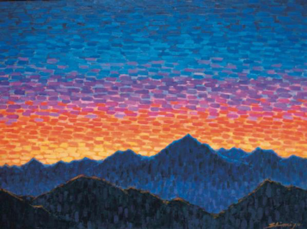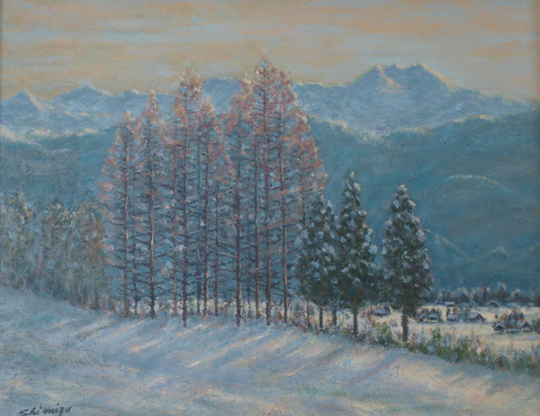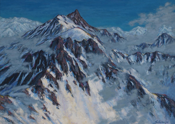 清水一好(しみずいっこう)昭和22年~(1947~)洋画家。岐阜県生まれ。岐阜県高山市在住。日本山岳画協会会員。元全日本山岳写真協会会員。 18歳で双六岳に初登山し、以後現在まで北アルプスを中心に登山を50年間愛好している。当初は山岳写真に熱中し「全日本山岳写真協会展」で最高賞を受賞した。昭和57年頃から山岳画を始め、故上原誠先生に師事し、山岳画一筋に「山」を30余年描き続けている。山との出会いを求め、ネパール(2回)、スイス、カナダ、北欧、国内(利尻山、桜島など)を旅行。公募展では、東光会、示現会、岐阜県展、高山市展に入選、入賞している。個展(山岳画展)は、高山市、富山市、伊那市で15回。グループ展は「日本山岳画協会展」(東京交通会館、モンベルストア)、「雑魚展」(岐阜県美術館)に出品している。その他、国立新美術館、東京都美術館、金沢21世紀美術館、豊田美術館、世田谷美術館、西山美術館、太田芸術画廊(上海市)などに出品。自宅の「飛騨山岳画廊 青い山脈」に常時40数点を展示し、爽やかな山の風光を伝えている。
